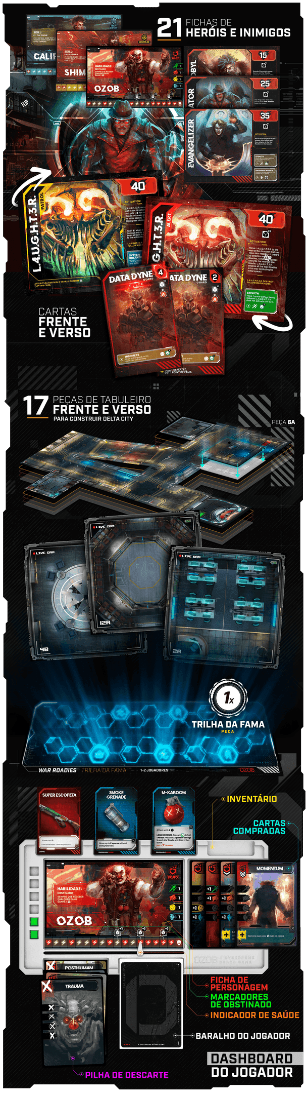 O Ozob The Cyberpunk Game é um marco histórico no financiamento coletivo brasileiro, arrecadando mais de R$ 6 milhões e mobilizando uma comunidade gigantesca. Participei do projeto como environment artist, sendo responsável pela criação de cerca de 80% dos tiles modulares que compõem tanto o jogo base quanto as expansões Asteroid Vegas e Residiuum, além dos terrenos especiais desenvolvidos para as metas de stretch goals.Além dos cenários, utilizei o Blender para modelar componentes essenciais da experiência de jogo, como o dashboard e os dados personalizados utilizados nas partidas. Minha missão foi traduzir a complexa estética cyberpunk em peças modulares que permitissem infinitas combinações de tabuleiro sem perder a funcionalidade e a coesão visual. O desenvolvimento foi um esforço coletivo da equipe de artistas da Iron Studios, com mecânicas assinadas por Renato e Jordy e suporte da Jambô Editora. Como o título ainda está em fase de produção, apresento aqui as visualizações autorizadas e divulgadas oficialmente durante a campanha.Ferramentas: Blender, Substance Painter, Photoshop.
